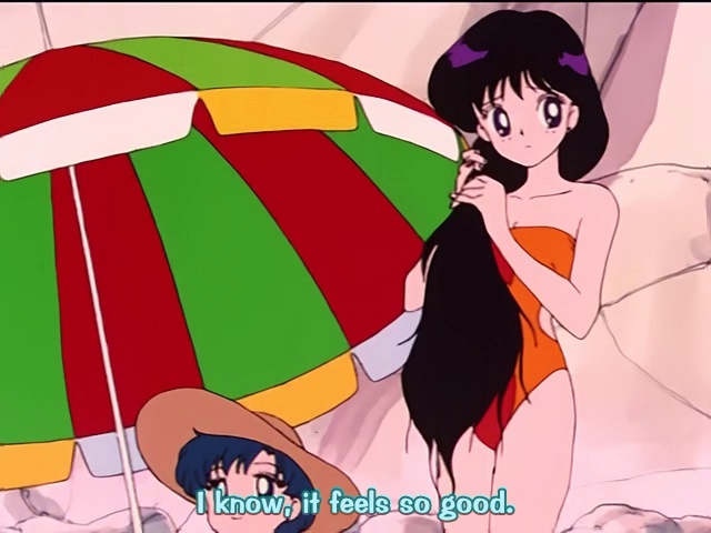 The next morning, it’s BEACH TIME, who cares about ghosts! And it’s the return of Usagi’s moth-eaten pink swimsuit from a few episodes ago! I have to say, Rei’s swimsuit is… lovely, just lovely. Ahem.