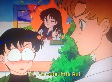 Motoki starts going on about Mako and Usagi, calling them “cute” but “too young”. Mamoru, who is dating Rei-chan, has a reaction that’s priceless.