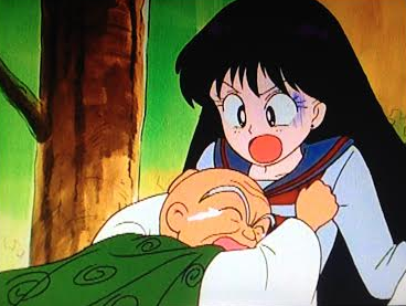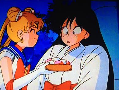 Usagi, mochi cakes in hand, turns up to “save the day”. Of course when Rei reveals that the monster is funny old Grandpa, Sailor Moon is unable to anything but offer mochi cakes to Rei, then start running.