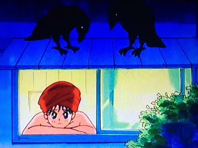 Rei’s crows (Japanese crows are massive by the way, like flying cats) Phobos and Deimos attack Zoisite and he runs away like a stupid duplicitous baby.