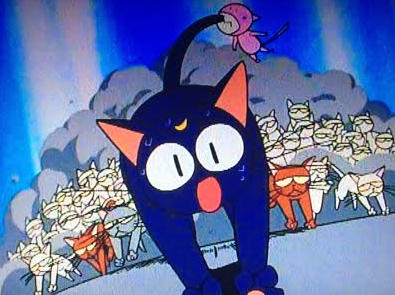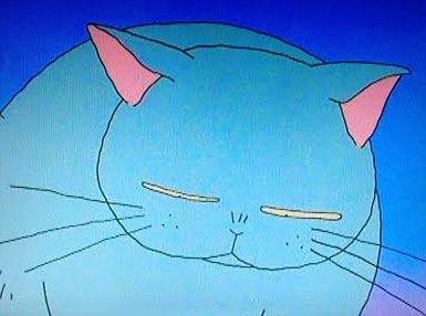 Finally, the other three Sailor Senshi arrive, and after being mean to a largely bewildered and not-at-all aggressive Rhett Butler-Monster, Sailor Moon restores him back into a cat. He even yells “Refresh!” like the human targets – it’s adorable.