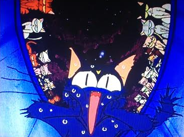 Zoisite, having successfully BEATEN UP A LITTLE GIRL (prick), attempts to use the Black Crystal on her to unleash the monster but oh noes – it doesn’t work! Zoisite realises that it must be “that ugly cat” that is the final Rainbow Monster.