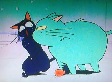 The romantic (?) scene between the cats is interuptted by the fat blue cat’s owner calling him. His name? Rhett Butler. I LOVE THIS.