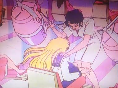 Kariko-Monster, in her quivering excitement (she really rather sinister in her eagerness) throws subtlety out the window and manhandles Minako. The other salon workers being to pump hairspray into the air, which conveniently knocks out everyone else in the room, saving the monster some embarrassment when it realises its mistake, probably.