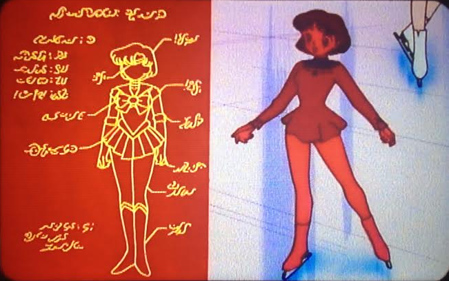 The episode starts with an ice-skating pair being featured on Usagi’s TV. She’s watching it with Minako and the cats Luna and Artemis, and the girls are delighted.