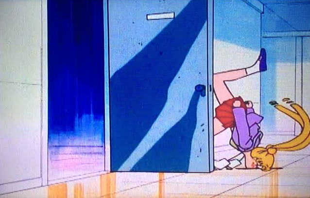 Janelyn briefly pauses on Usagi, poised to use the identification software (it uses body morphology), but thinks to herself that, although Sailor Moon is said to be a little clumsy, Usagi’s farcical ineptitude clears her suspicion.