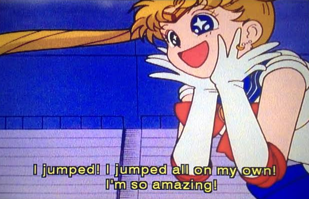 Her reaction of “I’m AMAZING!” is great too. Then Tux ruins the moment by saying, in English “Naisu jumpu da, Seraa Muun” (Nice jump, Sailor Moon), so he sounds like a twat.