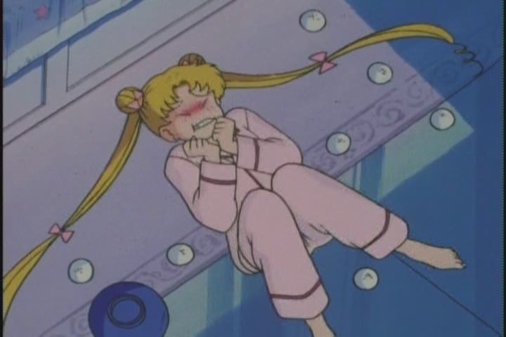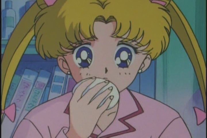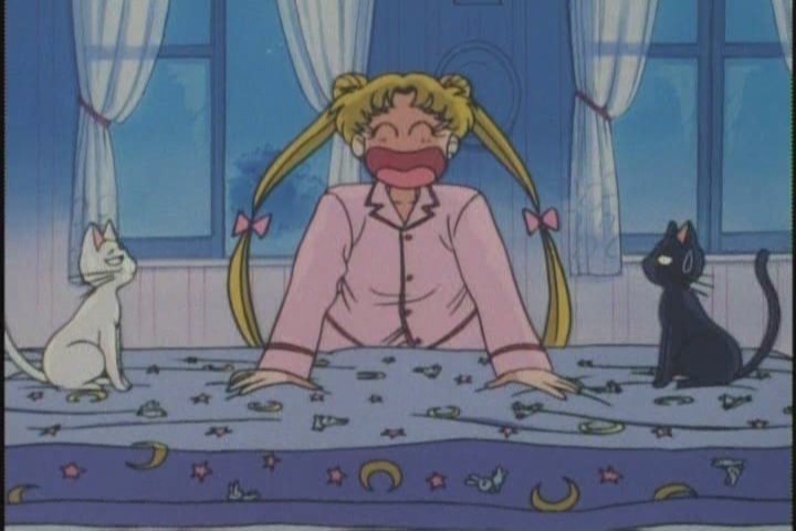 With her love being infected (molested…?) by some freaky dark alien energy, Usagi starts from her sleep. Luna expresses concern, trying to ease Usagi’s fears, but she really doesn’t need to, as the teenage girl begins eating pork buns in bed as a means of an emotional crutch.
