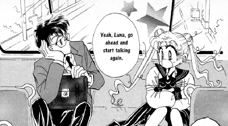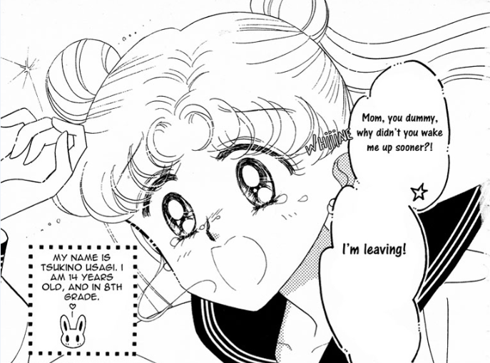 The manga starts off in very much the same way as the first episode of the anime: Usagi is late for school, meets Luna, turns into Sailor Moon and rescues Naru from her own demonic mother, but already the differences in tone can be seen in the first act.