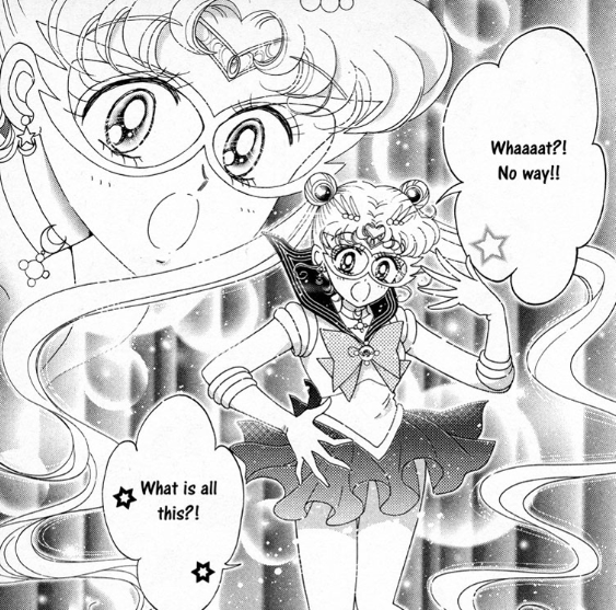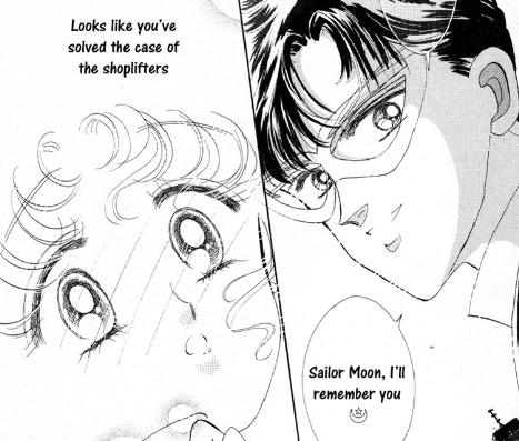 The biggest aesthetic change between manga and anime is Sailor Moon’s funky glasses. I actually rather like them, although she immediately takes them off after seeing a vision of Naru being attacked. They are there to mirror the pair that Sailor V wears, probably to underline their similarities between the Sailor V manga and the Sailor Moon manga.