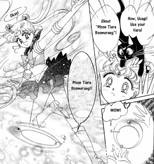The other big asthetic change in the first act is the Moon Tiara Action, or should I say the Moon Tiara Boomerang. Obviously a glowing disc is much easier to animate for the show, but the end result of the attack is markedly different, and fits in with the whole “starving to death” thing: