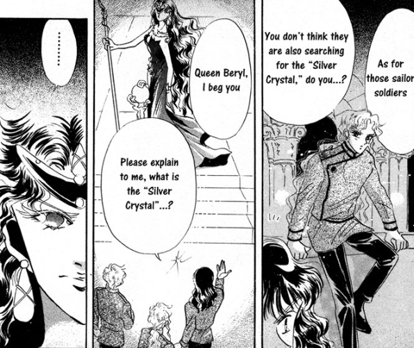 It opens in the Dark Kingdom, which looks completely different. Much more Palladian in design, very much like the Moon Kingdom. We’re also shown Queen Beryl, Jadeite, Nephrite (“General presiding over the North American territory” apparently) and Zoisite, all interacting. Moreover, they all seem to like each other. It’s so freaky seeing Zoisite being nice to Nephrite, or anyone at all paying attention to Jadeite.