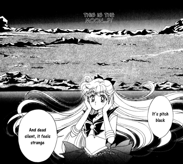 The girls use Sailor Teleport (although they don’t call it that, and just float up into space rather than teleporting) and arrive at the Sea of Serenity.