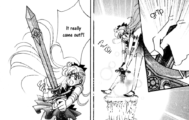 Luna leads the Senshi towards the remains of a “Crystal Tower”, and the focus shifts to a stone with a sword wedged in it, a la Kind Arthur. Now this is different.