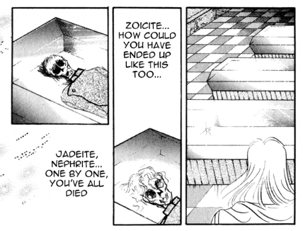 In the Dark Kingdom, Kunzite is staring at Zoisite’s corpse.