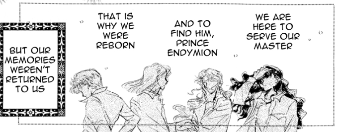 The Ginzuishou seems to bring the Great Four generals back to life! The crispy corpses of Jadeite, Nephrite and Zoisite all seem to be healed, and Kunzite remembers that they were Prince Endymion’s sworn guard, until Queen Beryl enslaved their souls.