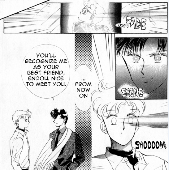 This next bit gets a bit confusing. Endymion finds out that Motoki works at the arcade, uses eye lasers to… I’m not 100% sure, but I think he totally kills Motoki’s friend from university, then brainwashes Motoki so that he recognises Endymion as this newly-deceased friend.