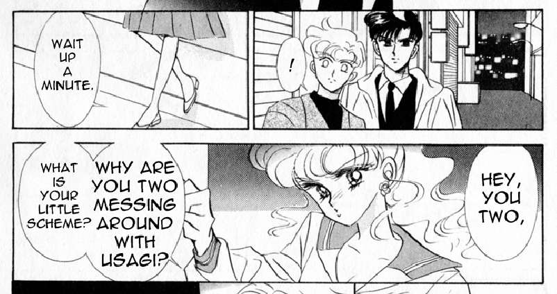Despite Mamoru obviously being evil and that, the other Sailor Senshi take their time intervening. Makoto final confronts him and Motoki, by herself, as a human, at night, in a dark alley. Smart. Mamoru instantly mesmerizes her, such is her vulnerability to charm.