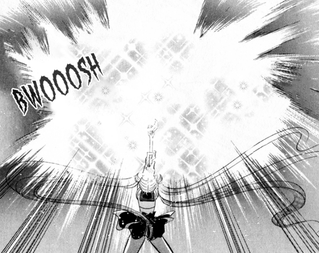 Sailor Moon, wielding the Ginzuishou, isn’t doing much against Metalia. On the Moon, it’s quite a different story. A great crystal tiller begins reforming, and then the Moon in general appears to be pulsing with energy.