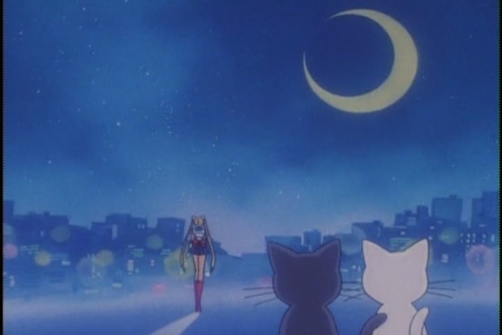 Luna and Artemis are happily watching Usagi’s normal life. Artemis leans in on Luna at the end of the scene, suggesting they get it on (puke), but Luna *correctly* responds by tearing Artemis’ face into ribbons.