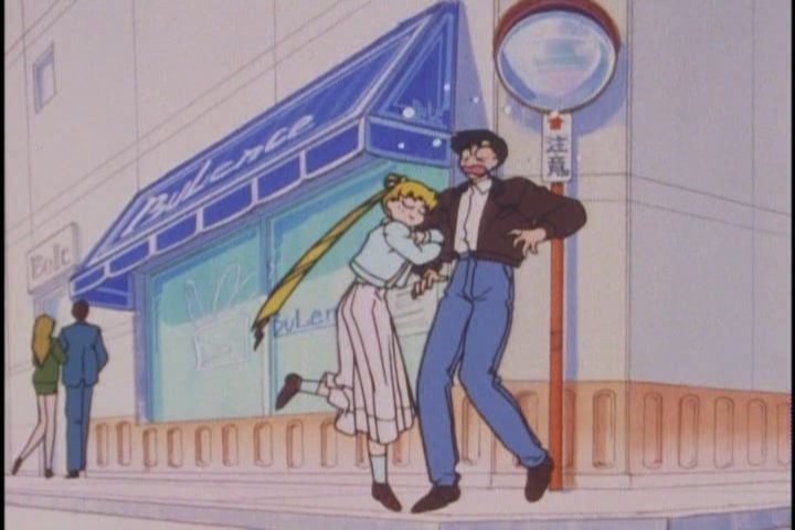 The episode beings with Usagi hanging on the arm of Mamoru, who is distinctly disturbed. He hadn’t even told her his name by this point. I feel terrible for Usagi in this scene, after all these two went through in the previous series, she’s still denied her heart’s desire.