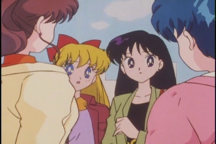 Outside the TV station, Ami, Makoto, Rei and Minako all bump into each. They all introduce themselves (it takes quite a while, the Japanese love their introductions) and all get a weird feeling. I guess love or friendship or junk is stronger than amnesia.