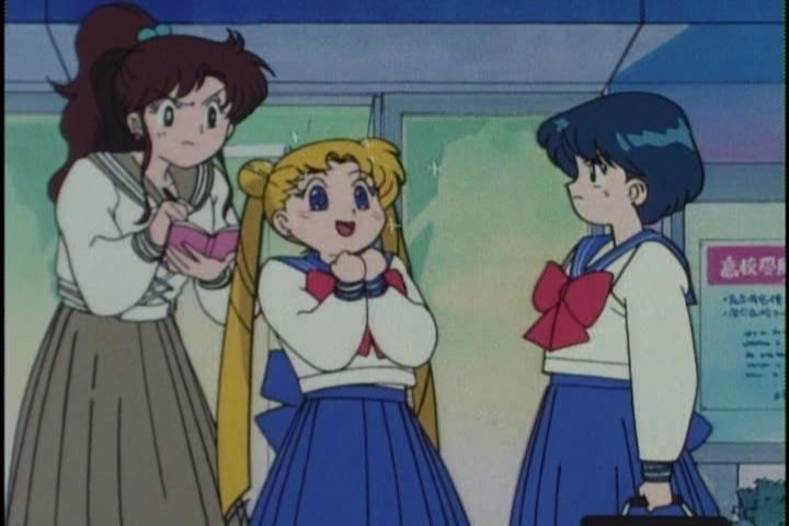 While waiting for the train home, Usagi is trying to convince Ami to give her last minute coaching on a test they have on the following day. It’s really quite adorable to see her desperately smarming up to Ami, but she’s not having any of it, giving it the old Hermione treatment of “how will you learn!?”