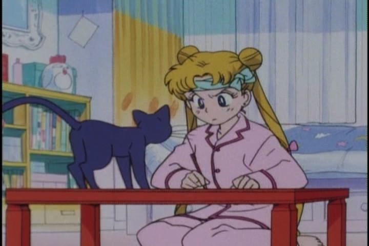 Finally, Usagi is at home at night, wondering if the Moonlight Knight actually be Endymion, when her romantic reveries are rudely interupted by Luna, holding a textbook, and reminded Usagi to STUDY.