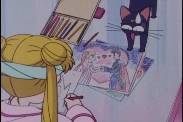 Sadly, she follows this up by showing him her drawings of Princess Serenity and Endymion. They’re actually pretty good! I especially like her drawing of Queen Beryl looking all menacing.