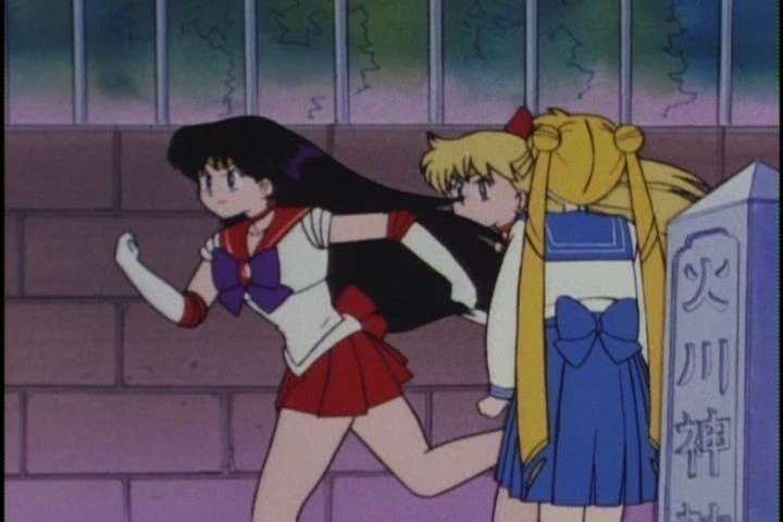 At the shrine, Rei has used her powers to identify the aura of Felion the pink-lion-lady thing, and the Sailor Senshi run out to battle. They run past a completely bemused and ordinary Usagi and have to yell at her to transform, which I found very amusing.