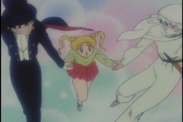 Usagi, meanwhile, is being led along by the hand by Mamoru, and she’s falling into one of those weird threesome-fantasies again with her, Tuxedo Kamen and Moonlight Knight, the third of which relates in real life to Shingo tugging on her arm.