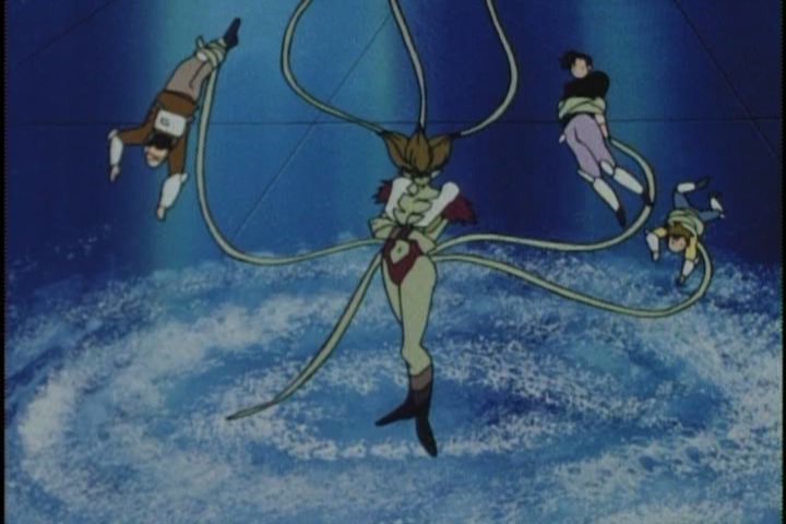 Hell-Ant has a rather comical fight with Usagi’s dad before Mamoru turns up and throws his laser pack at the monster, but she eventually grabs all three of the guys and fucks them with her tentacles before Sailor Moon finally arrives.