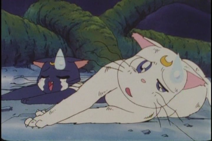Despite the fact that this is the “final battle” against Ali & En, Sailor Moon’s introduction makes so little sense that, even injured, Luna and Artemis pull out their wtf-faces. Gosh I love her.