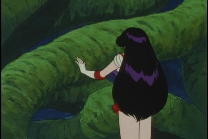 Inside, just horrible David Cronenberg-esque things are happening. Shoots appear from the tree to squirt acid at the Senshi, which are probably meant to look like carnivorous plants, but look more like an acidic vagina.