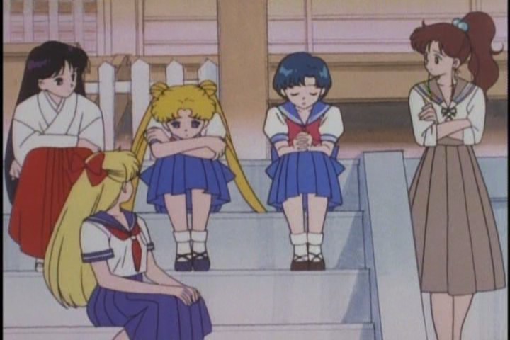 At the shrine, the girls are all as shocked as Usagi. They are… utterly unhelpful, actually. Minako’s advice is just fucking awful“He was probably in a bad mood, and that’s why he said those things!”