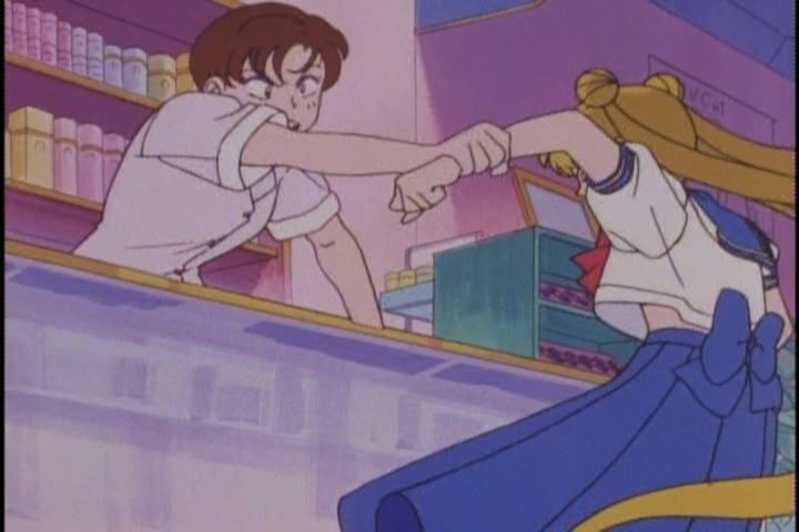 This sets Usagi off. She’s already fragile from all the crying, and despite Mamoru’s being a complete bastard to her, she shouts at the attendant, drawing the eyes of all the women in the store. My favourite bit is where she yells “ARE YOU STUPID OR SOMETHING?”