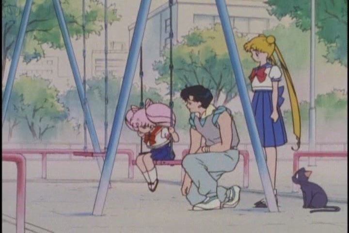 We might be rolling our eyes at Chibi-Usa’s escape, putting herself in danger and all (and believe me, that will come), but for now her sad little form sitting on a lonely swing, set to a truly melancholic tune, is really rather sympathetic.