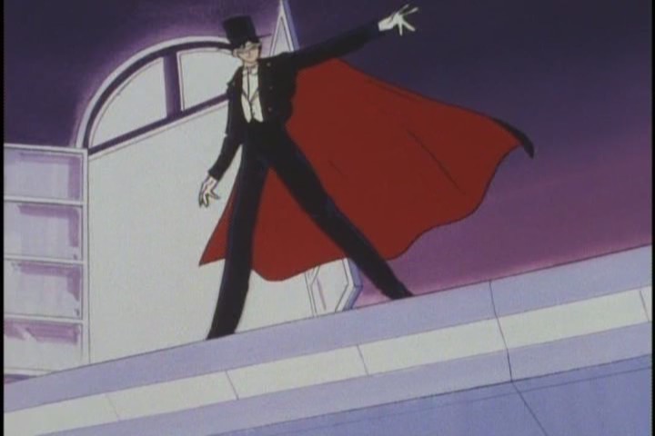 Just as Sailor Moon is about to have a make-over (“You WILL put on make-up!“), who should arrive but Tuxedo Kamen.