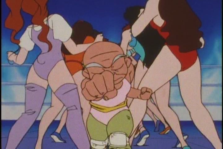 Just as Dumble is about to perform her ultimate attack, the Dumble Elbow Drop (it’s accurate, if not the most inspired of names) on an injured Granpda, but Rei has finally come to the rescue of her stupid pervert grandfather.