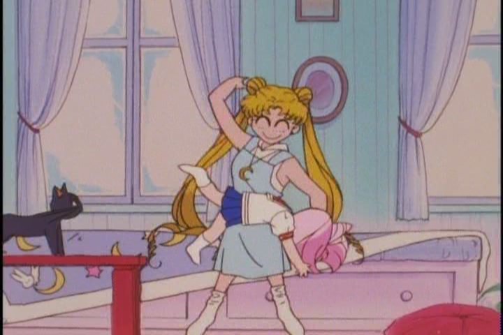 I like how Usagi suddenly remembers she has more important things to do and just throws Chibi-Usa on the floor. Physical punishment is, from my perspective, not funny. Except for here, of course.