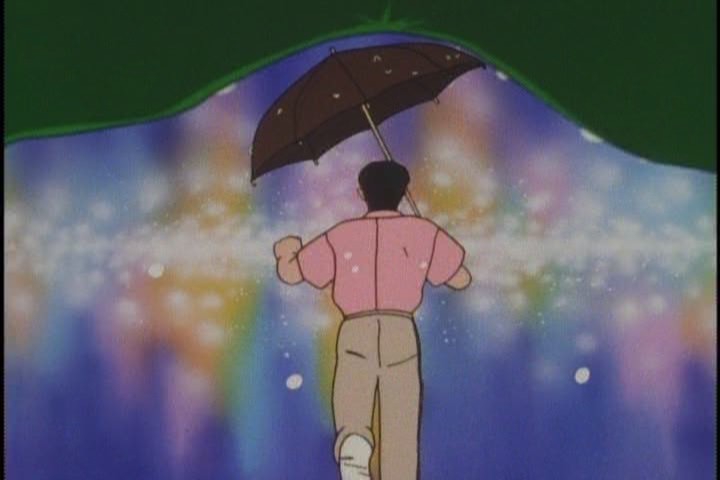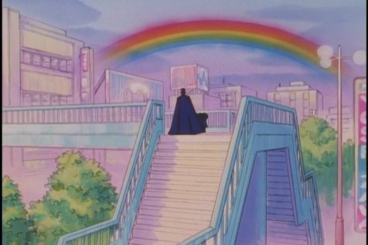 The final scene is of a drying and sunny evening in Tokyo, with Chibi-Usa hand in hand with an obliging Tuxedo Kamen. Chibi-Usa is singing a funny little song about rain. It would be touching if Chibi-Usa didn’t look so slavishly at Tuxedo Kamen…