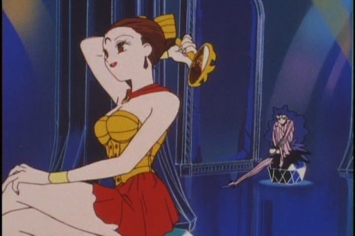 The episode starts in the Black Moon UFO. The Phantom Sisters are being extremely… well, themselves. All are preoccupied with their appearance. Petz, the eldest & green haired lady, is busying herself with applying black lipstick, with a “I’m thinking about bringing the colour of the dead into fashion this summer.” I like Petz. She’s so morbid.