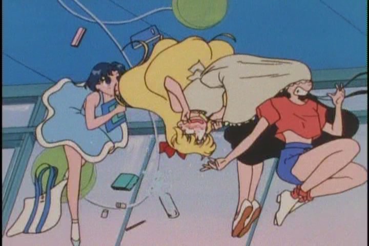 There are some great jokes here. Rei flies up Minako’s skirt, who is rather offended, while Ami, the brains of the bunch, is merely enjoying the broken physics engine happily. I’d be over the moon, personally. About both events, obviously.