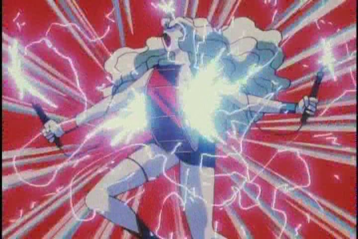 As Furaiki seems ready to electrocute Sailor Moon once and for all, Tuxedo Kamen finally turns up by a window and pierces the Droid’s drum with a thrown rose. What a champ. Oh, sorry, I meant chump.