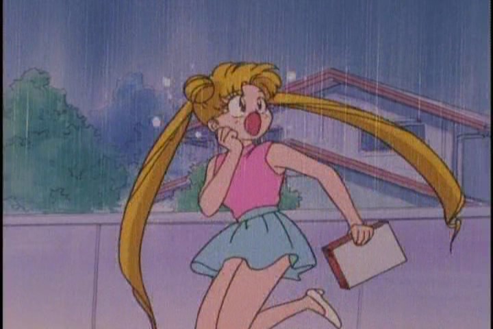 Poor Usagi is running home when it starts raining. When the thunder hits, she runs off terrified.