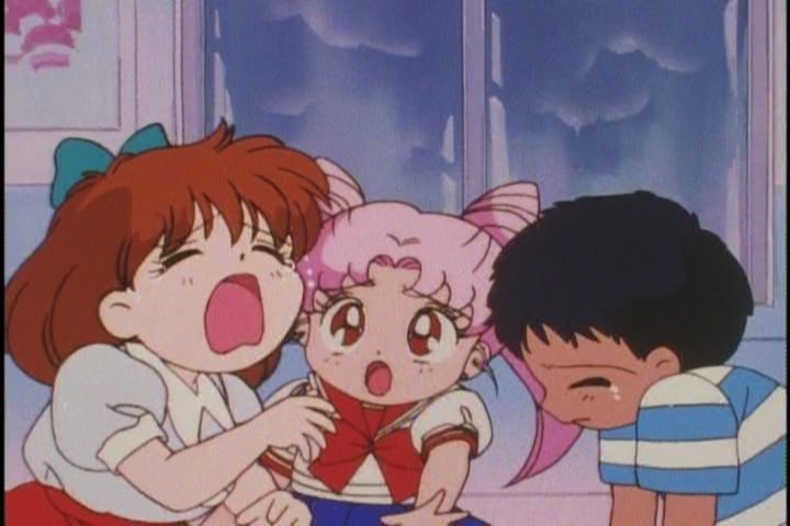 Meanwhile, at elementary school, the final few little kids are still waiting to be picked up by their parents. All are rather upset, but Chibi-Usa remains strong and encouraging, despite her own fear, especially to one little boy who looks like his bunny just died.