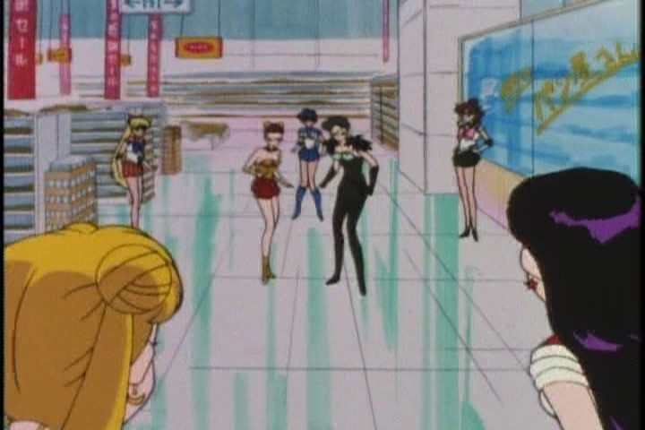 Just as we think Sailor Moon and Sailor Mars might be in for a serious fight, the Phantom Sisters begin arguing about who gets to kill first, which gives time for the remaining Senshi to turn up and surround them.