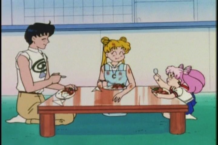 Chibi-Usa eventually ropes Rei into helping them make curry instead, after hearing Rei boast of being able to make a wide variety of curry, Indian, Sri Lankan, Japanese (not realising that they’re all instant.)