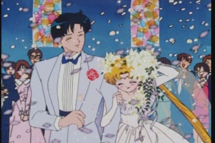 We zoom out to reveal that we’re at Usagi and Mamoru’s wedding, which is more than a little odd, especially when  you consider that we’re in a Christian church ceremony. Usagi’s life has always been markedly more Western than the typical Japanese person, this is just an extension of that I suppose.