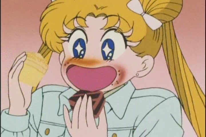 Usagi is continuing to stuff herself, now seemingly at the encouragement of her friends. Makoto asserts that “There’s only one way to cure her, and that’s for her to eat all she can!”